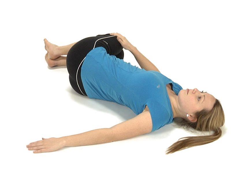 Lie down on your back while keeping your knees bent and your feet soles on the ground. Then roll both your knees to the left side of the floor; make sure to keep your shoulders and neck on the ground. Hold for 15 seconds. Repeat to the right side. Do this stretch twice a day.